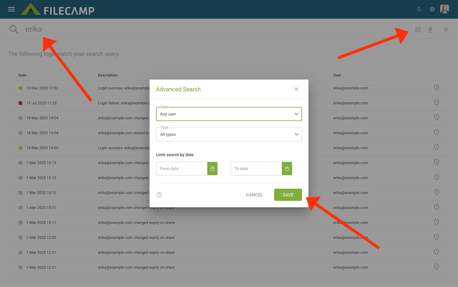 icon and search for specific Log types, User tasks, or define a time period you wish to review more closely. This is useful when you want a more detailed overview of the activity on your account or to view older log entries, you can easily search using the Search log entries function.